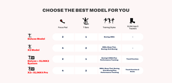 Streamlined with 2 focus pads & 1 T‑Bar, Deluxe is perfect for mastering punches, elbows & knees when space is limited or you’re focused on upper‑body technique.